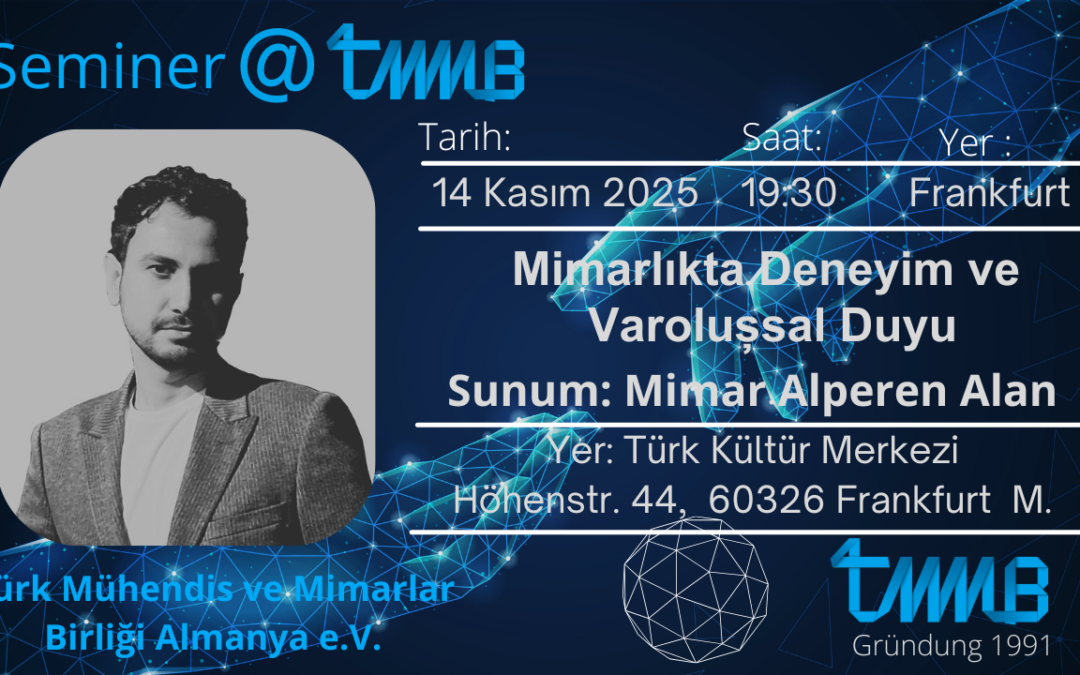 Seminer, mimari örüntüler ile sosyokültürel çevre arasındaki ilişkiyi “varoluşsal anlam” bağlamında sorgulayacak ve örnek olarak İstanbul-Eminönü’nden örüntüler sunacaktır. Varoluşsal temelli bir deneyimle yaklaşımın, mimarlığın şiirsel, duyusal ve hümanist gücünü ortaya koyduğu vurgulanacaktır. Tarih: 14 Kasım 2025, Yer: Türk Kültür Merkezi, Saat:19:30, Adres: Höhenstr. 44. 60326 Frankfurt M